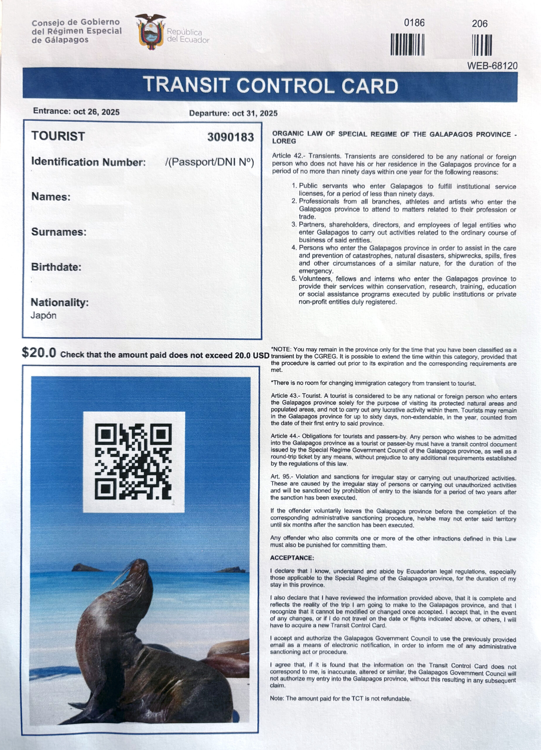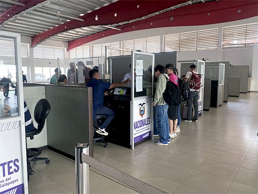 入島者管理は、出発前にCONSEJOカウンターで交付を受けた入島カードに必要事項を記入して提出することが義務付けられています。予め飛行機の中で必要事項の記入を済ませて用意をしておきましょう。 カウンターでは、入島料が徴収されます。ガラパゴス諸島を訪れる12歳以上の外国籍旅行者は、ガラパゴスへの到着時に一人当たりUS$200.00(12歳未満はUS$100.00)を支払います。 ガラパゴスに到着すると手荷物の検査を受けます。持ち込み規制に抵触する食品、果物や草花の種などは没収されますのでお気をつけください。 |